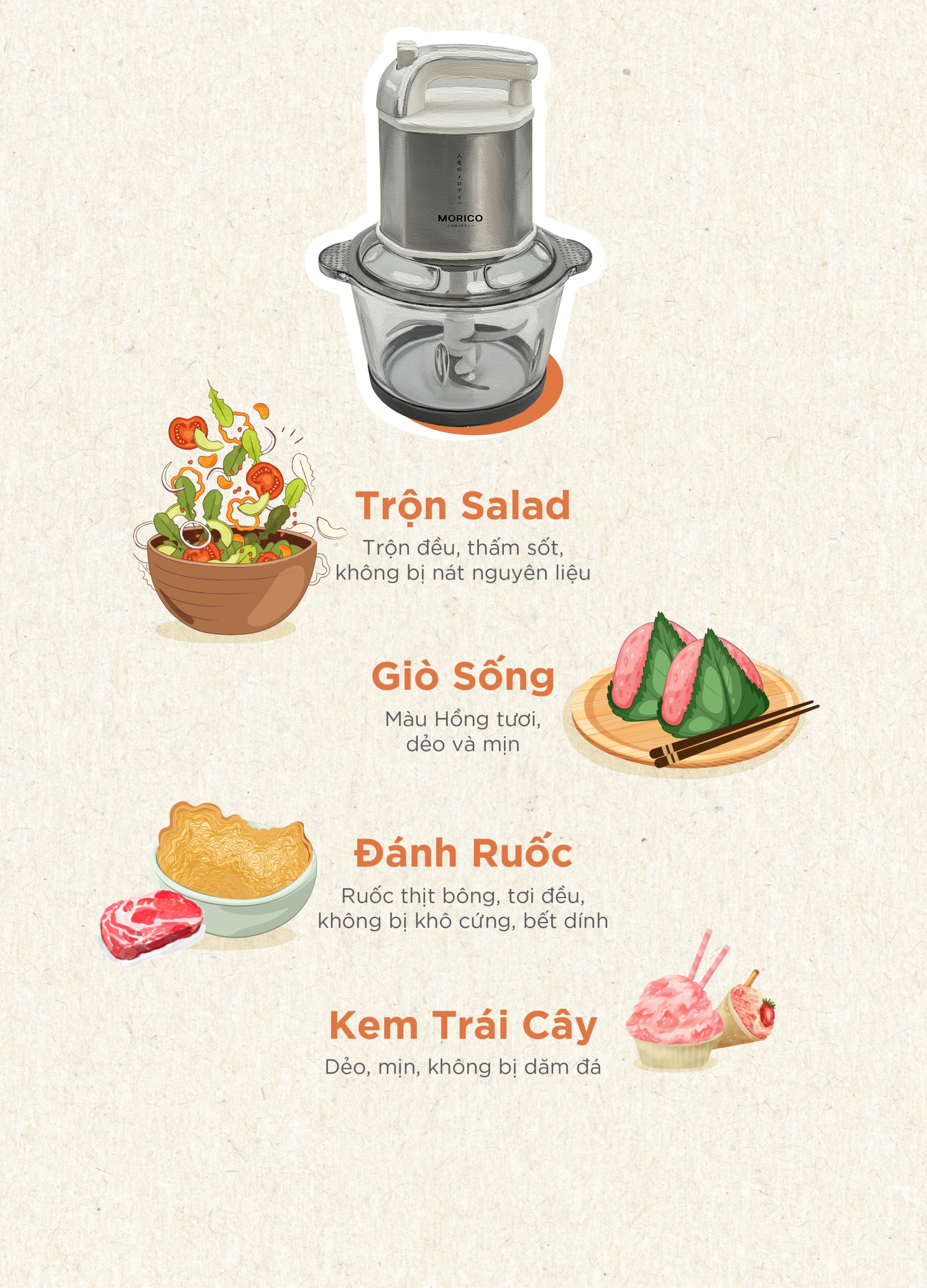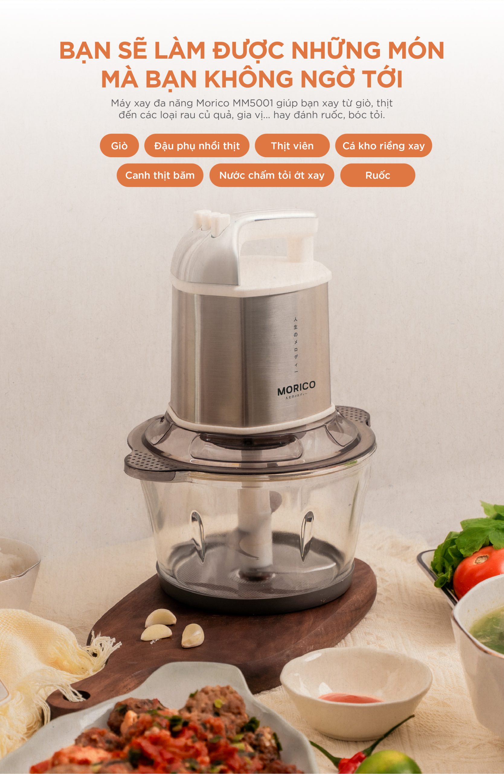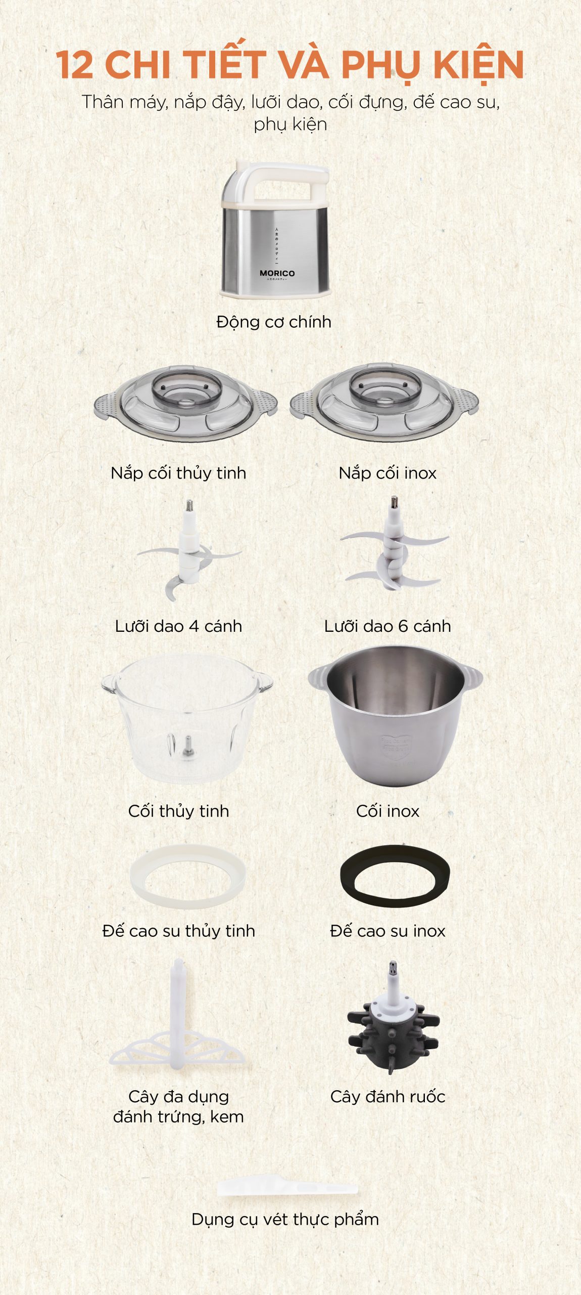 Không chỉ dừng lại ở khả năng xay thịt, rau củ hay gia vị, Morico MM5001 còn được đánh giá cao nhờ 12 chi tiết phụ kiện đi kèm, nhiều nhất trong các dòng máy cùng phân khúc. Với trục đánh ruốc, trục đánh kem, cây vét đa năng và các phụ kiện khác, bạn có thể dễ dàng thực hiện thêm nhiều công việc nhà bếp: bóc vỏ tỏi, làm ruốc, xay riềng sả, chế biến cháo dinh dưỡng cho bé… Tất cả gói gọn trong một chiếc máy duy nhất.
