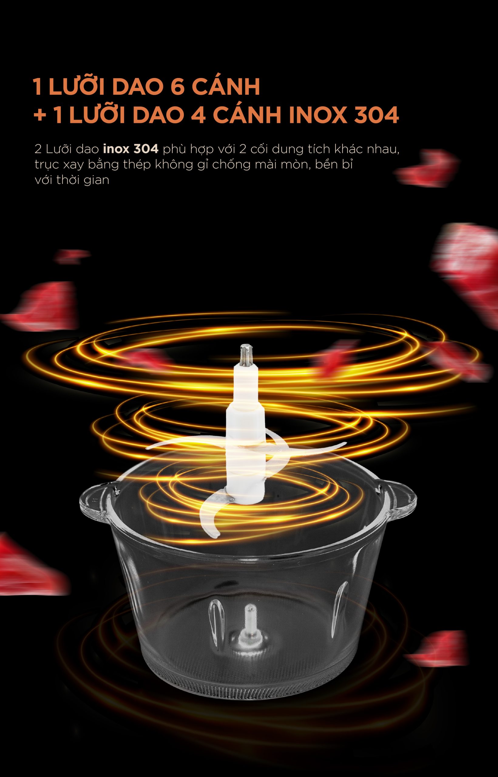 Máy sở hữu 2 bộ lưỡi dao chuyên biệt: một lưỡi 6 cánh và một lưỡi 4 cánh, đều được làm từ inox 304 không gỉ, sắc bén và an toàn tuyệt đối cho sức khỏe. Thiết kế lưỡi dao kết hợp cùng trục xay bằng thép không gỉ giúp máy vận hành mạnh mẽ, chống mài mòn và bền bỉ theo thời gian.