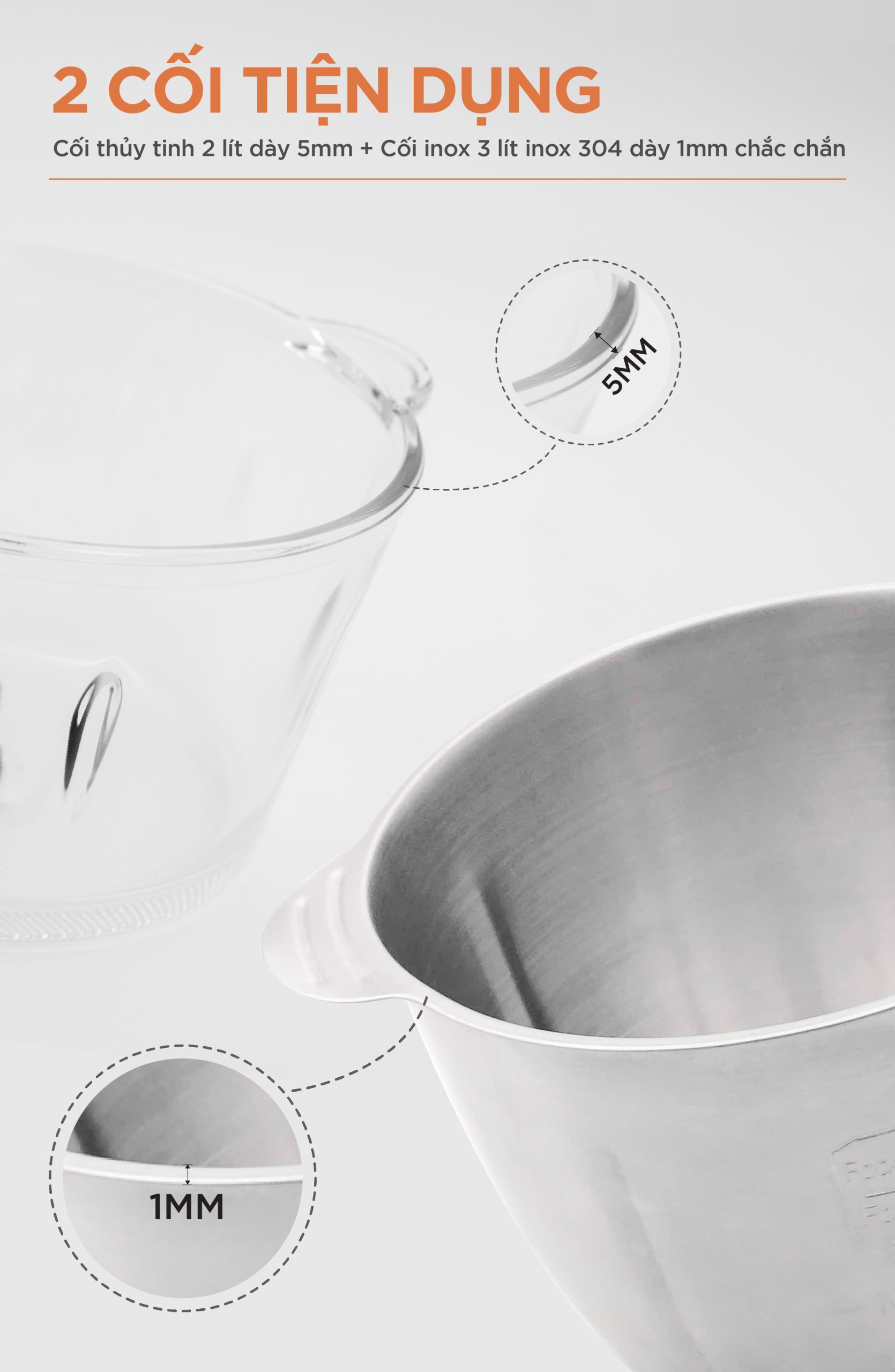 Morico MM5001 được trang bị hai cối xay tiện lợi: một cối thủy tinh 2 lít dày 5mm và một cối inox 3 lít bằng inox 304 cao cấp, chắc chắn. Tổng dung tích lên đến 5 lít, giúp bạn thoải mái chế biến khối lượng thực phẩm lớn chỉ trong một lần. Máy có thể xay tới 1kg thịt cùng lúc, đủ để làm nem cho cả 5 mâm cỗ – tiết kiệm thời gian và công sức đáng kể cho những bữa tiệc gia đình.
