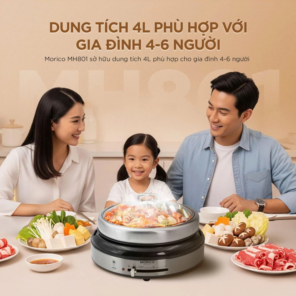 Morico MH801 sở hữu dung tích 4L phù hợp cho gia đình 3-5 người. Nồi có công suất 1300W giúp làm chín thực phẩm nhanh mà không gây cháy khét. Vừa tiết kiệm thời gian vừa đa năng, rất thích hợp với các bữa cơm gia đình.