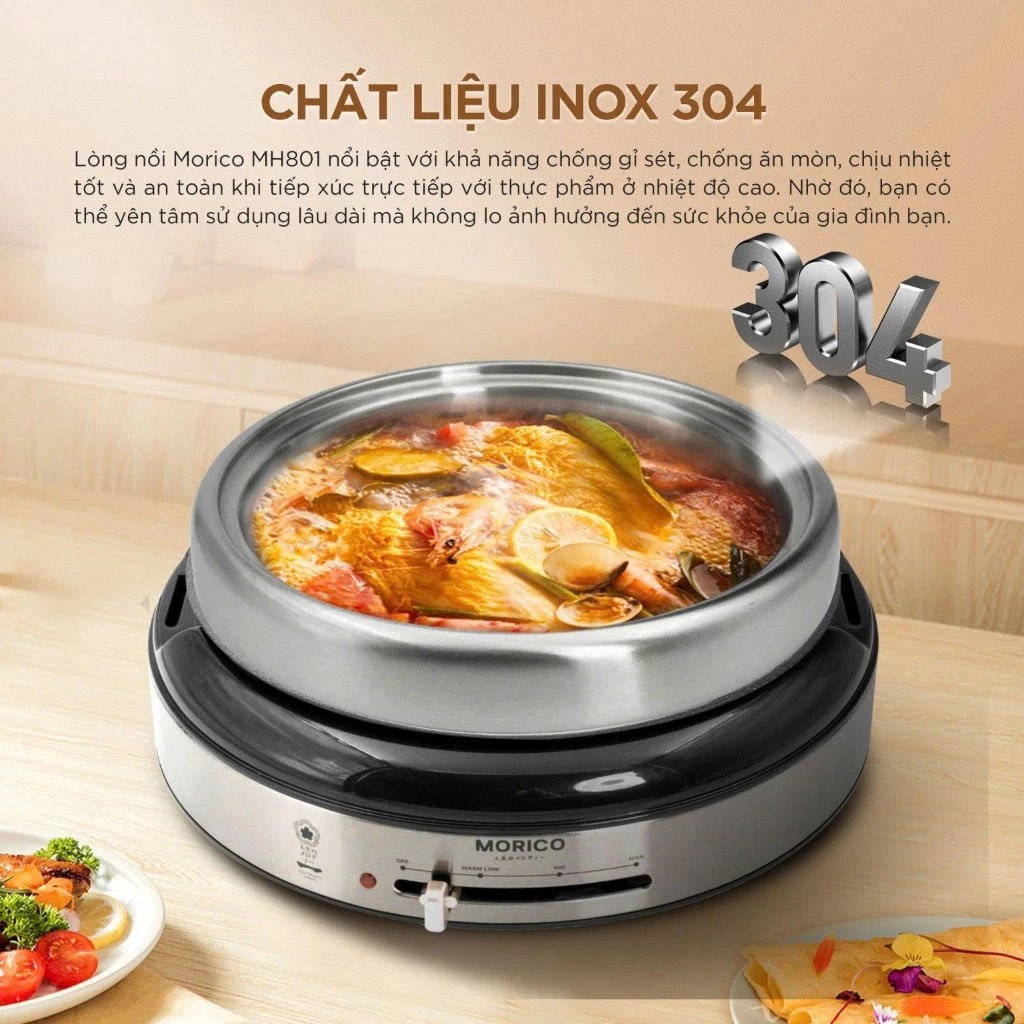 Lòng nồi Morico MH801 sử dụng inox 304 – nổi bật với khả năng chống gỉ sét, chống ăn mòn, chịu nhiệt tốt và an toàn khi tiếp xúc trực tiếp với thực phẩm ở nhiệt độ cao. Nhờ đó, bạn có thể yên tâm sử dụng lâu dài mà không lo ảnh hưởng đến sức khỏe của gia đình bạn.
