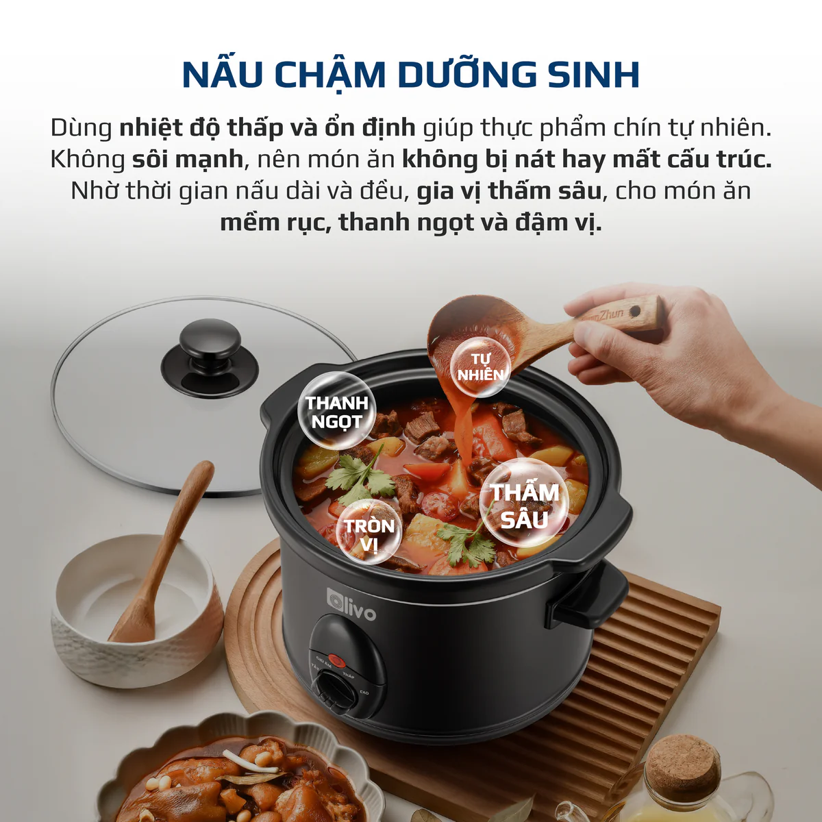 - Nồi nấu chậm OLIVO SC25/SC30 được trang bị hệ thống gia nhiệt tuần hoàn, lan tỏa đều xung quanh lòng nồi thay vì tập trung vào một điểm. Nhờ cách truyền nhiệt ổn định này, thực phẩm được nấu chín từ từ, mềm sâu mà không bị trào sôi hay mất nước. Mỗi nguyên liệu từ xương hầm, hạt đậu đến thịt cá đều thấm gia vị từ trong ra ngoài, giữ lại trọn vẹn hương vị tự nhiên và cấu trúc ngọt lành vốn có. Đây là yếu tố tạo nên sự khác biệt của nấu chậm: món ăn đậm đà, hài hòa mà vẫn bảo toàn dưỡng chất theo cách nhẹ nhàng và thuần khiết nhất.