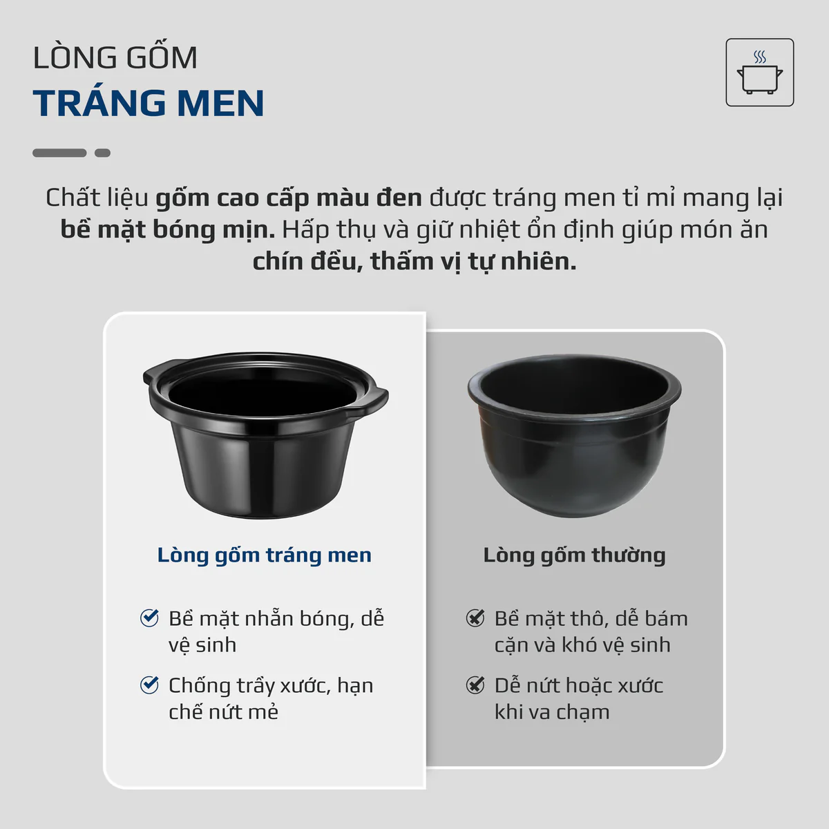 1. LÒNG GỐM TRÁNG MEN – GIỮ NHIỆT CHUẨN, VỊ NGON TRỌN VẸN